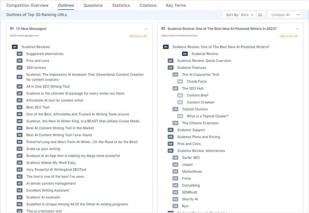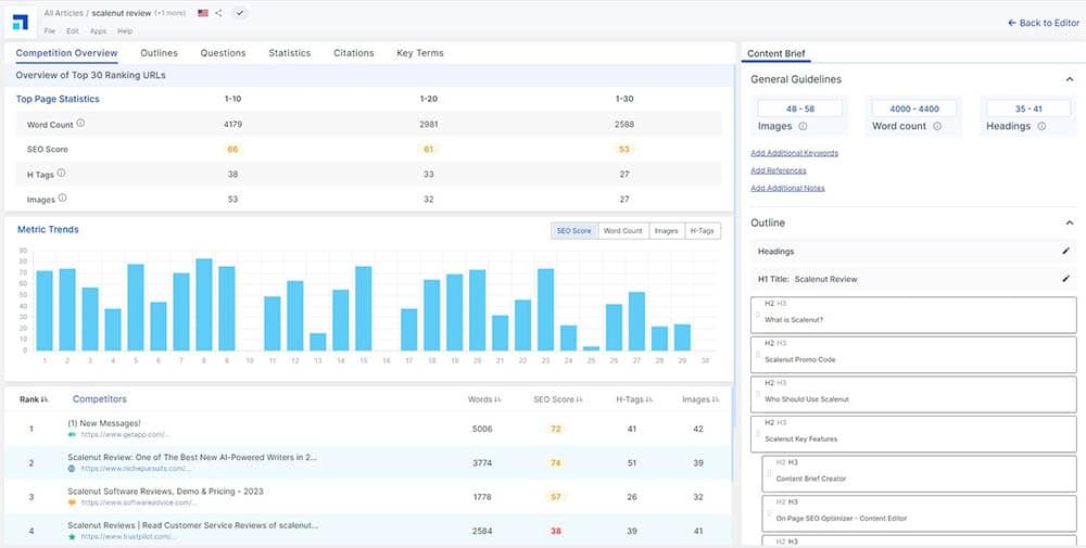 The ranking factors for all on page SEO tools are based on the ranking competitors. Word count, heading count, image count, keyword usage, and related keywords are all based on the selected competitors. Depending on the keyword phrase, not all competitors will have content that should be considered when writing an article. If you are writing a service page for a local business, you don’t want your content to be based on Yelp or other directory listings that won’t have relevant content. Scalenut uses the top 30 competitors and does not allow you to change this. Until they include competitor selection, they will not be the leading on page SEO tool or be a full Surfer SEO replacement.