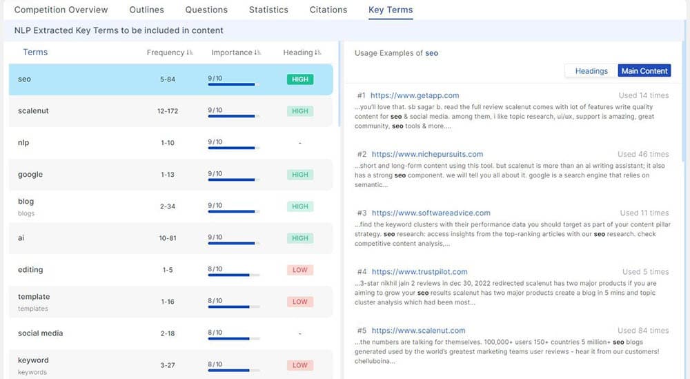 This is the collection of keywords, their usage rates, and all examples and sites that use them. We prefer to focus on what we feel adds value and mostly ignore this in the content brief section, but it is valuable if you care about your competitors and want to do a deeper dive.